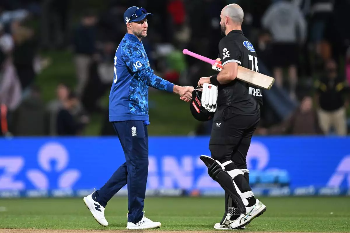 England's Joe Root, left, and New Zealand's Daryl Mitchell shake hands following their T20 cricket match in Hamilton, New Zealand, Wednesday, Oct. 29, 2025. (Andrew Cornaga/Photosport via AP)