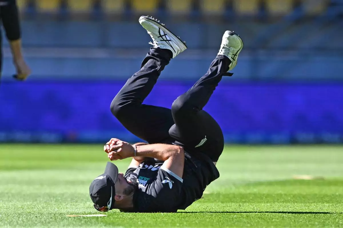 Daryl Mitchell of New Zealand takes a catch to dismiss Brydon Carse of England during the One Day International cricket match between New Zealand and England in Wellington, New Zealand, Saturday, Nov. 1, 2025. (Kerry Marshall/Photosport via AP)