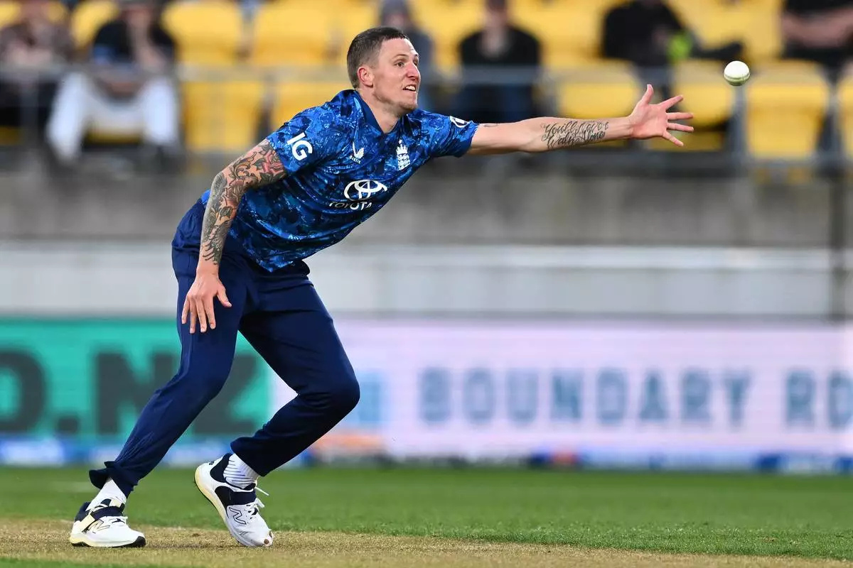 Brydon Carse of England attempts to field the ball during the One Day International cricket match between New Zealand and England in Wellington, New Zealand, Saturday, Nov. 1, 2025. (Kerry Marshall/Photosport via AP)