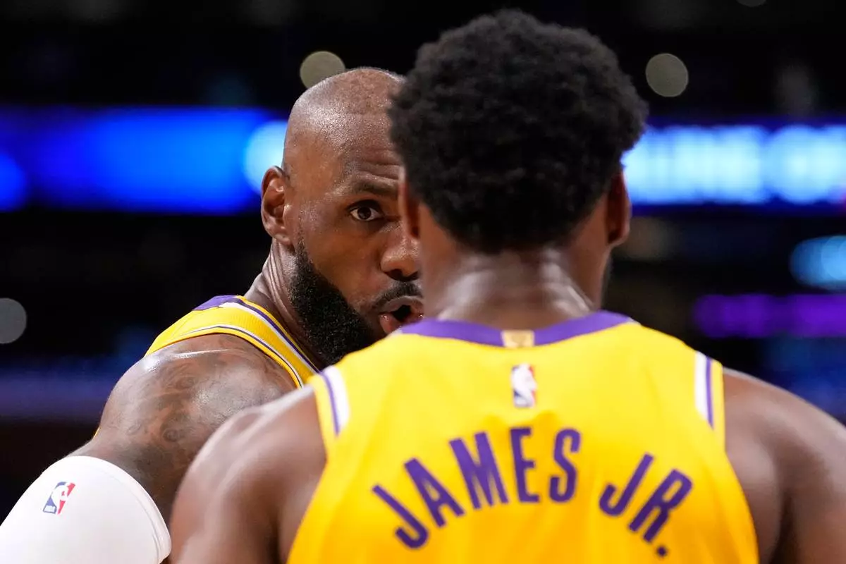 Los Angeles Lakers forward LeBron James, left, talks to his son guard Bronny James during the first half in Game 1 of a first-round NBA playoffs basketball series against the Houston Rockets, Saturday, April 18, 2026, in Los Angeles. (AP Photo/Mark J. Terrill)