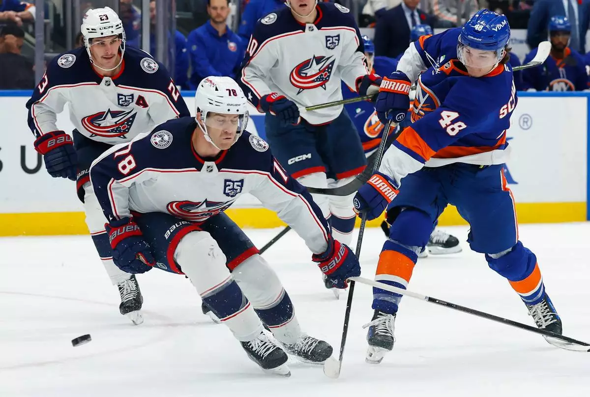 Columbus Blue Jackets defenseman Damon Severson (78) plays the puck against New York Islanders center Calum Ritchie (64) during the first period of an NHL hockey game, Sunday, Nov. 2, 2025, in New York. (AP Photo/Noah K. Murray)