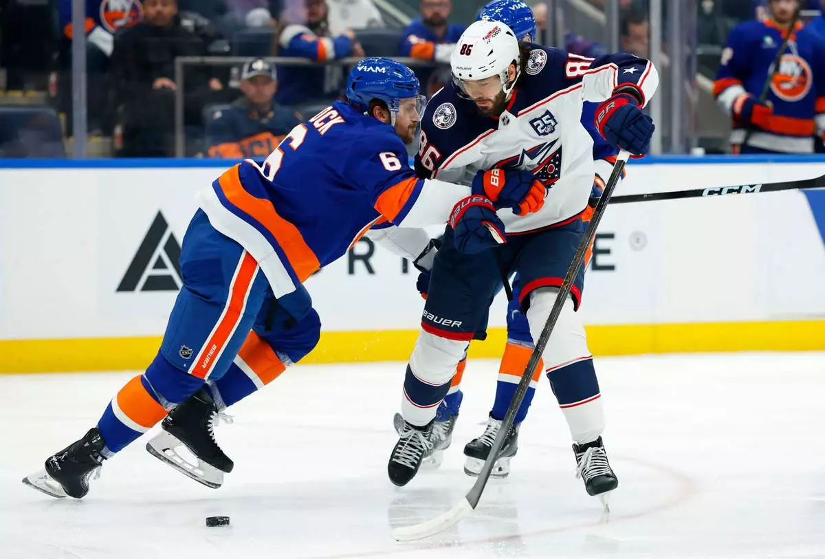 Columbus Blue Jackets right wing Kirill Marchenko (86) plays the puck against New York Islanders defenseman Ryan Pulock (6) during the first period of an NHL hockey game, Sunday, Nov. 2, 2025, in New York. (AP Photo/Noah K. Murray)