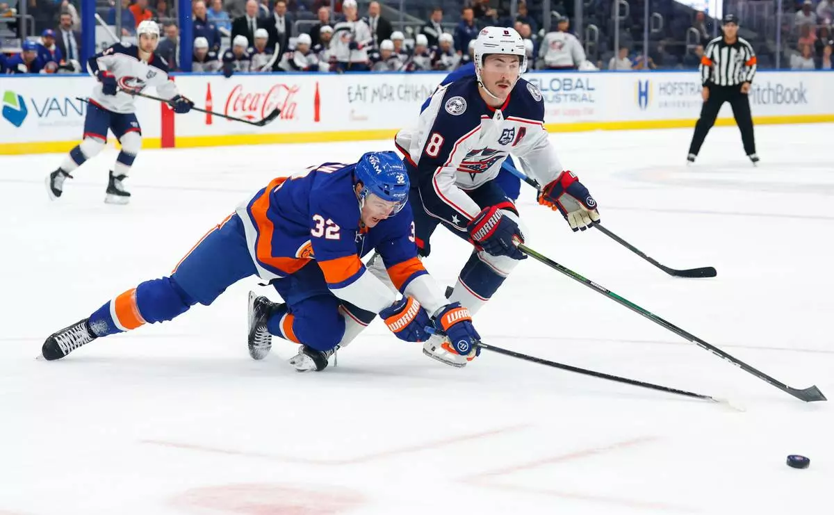 New York Islanders center Kyle MacLean (32) battles Columbus Blue Jackets defenseman Zach Werenski (8) for the puck during the first period of an NHL hockey game, Sunday, Nov. 2, 2025, in New York. (AP Photo/Noah K. Murray)