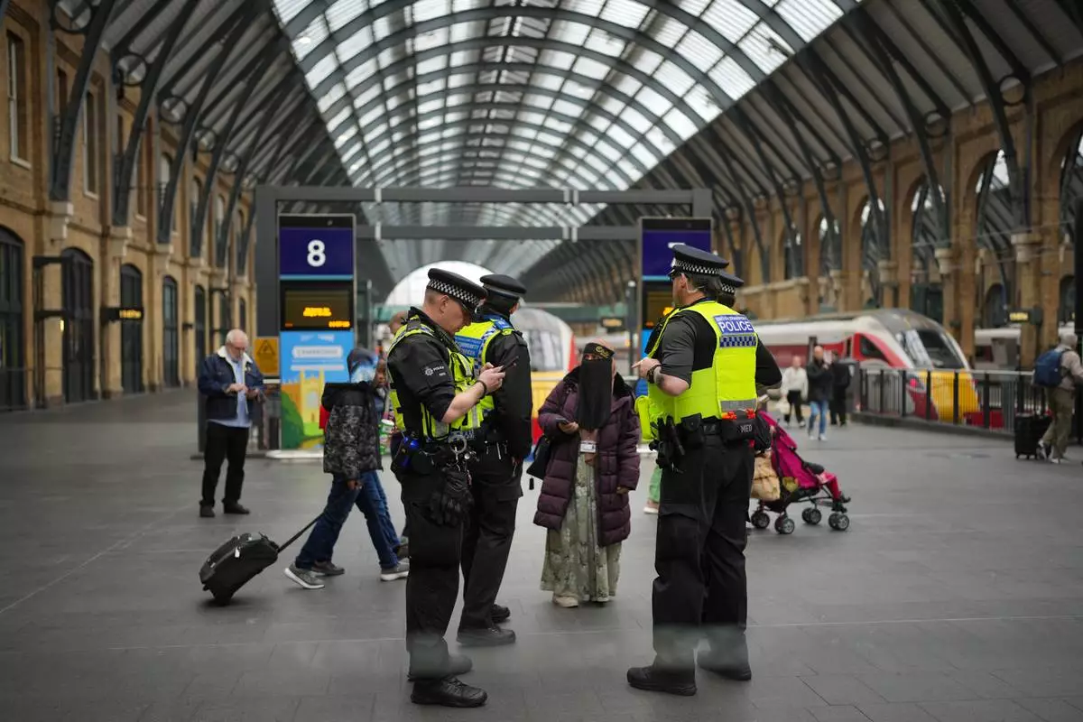 Police officers patrol King's Cross train station, in London, Monday, Nov. 3, 2025. (AP Photo/Kin Cheung)