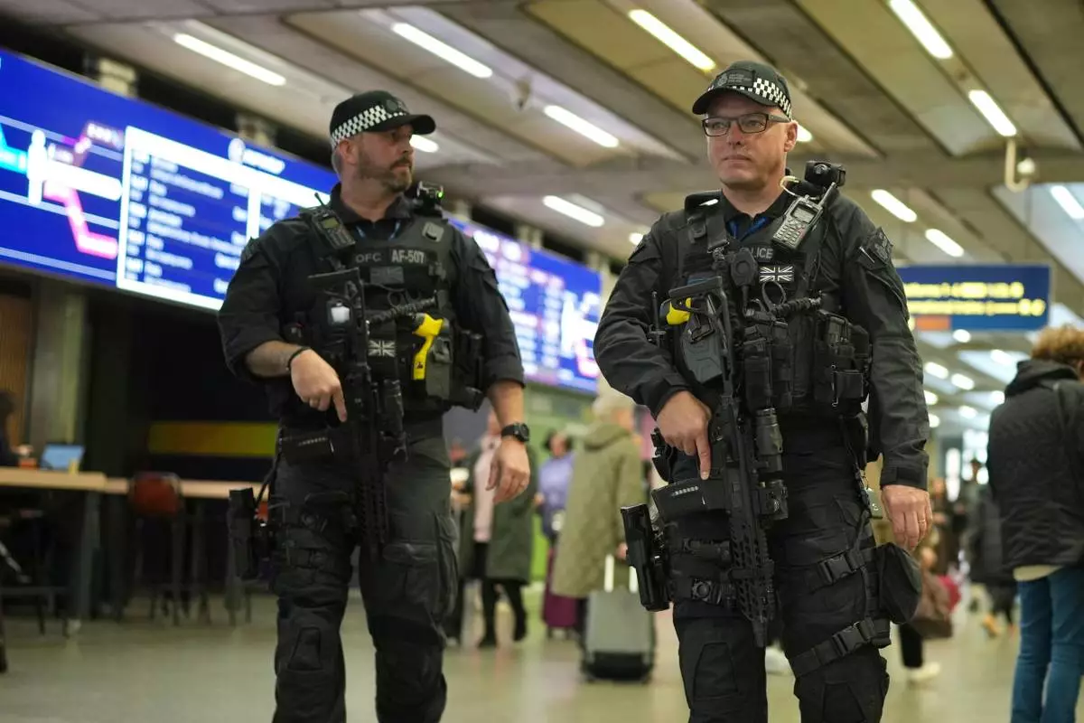 Armed police officers go on patrol at St Pancras International train station in London, England, Monday, Nov. 3, 2025. (Yui Mok/PA via AP)