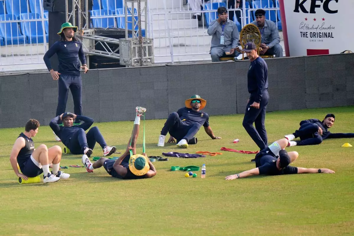 South Africa's Nandre Burger, left, and teammates warm up before a practice session, in Faisalabad, Pakistan, Monday, Nov. 3, 2025. (AP Photo/Anjum Naveed)