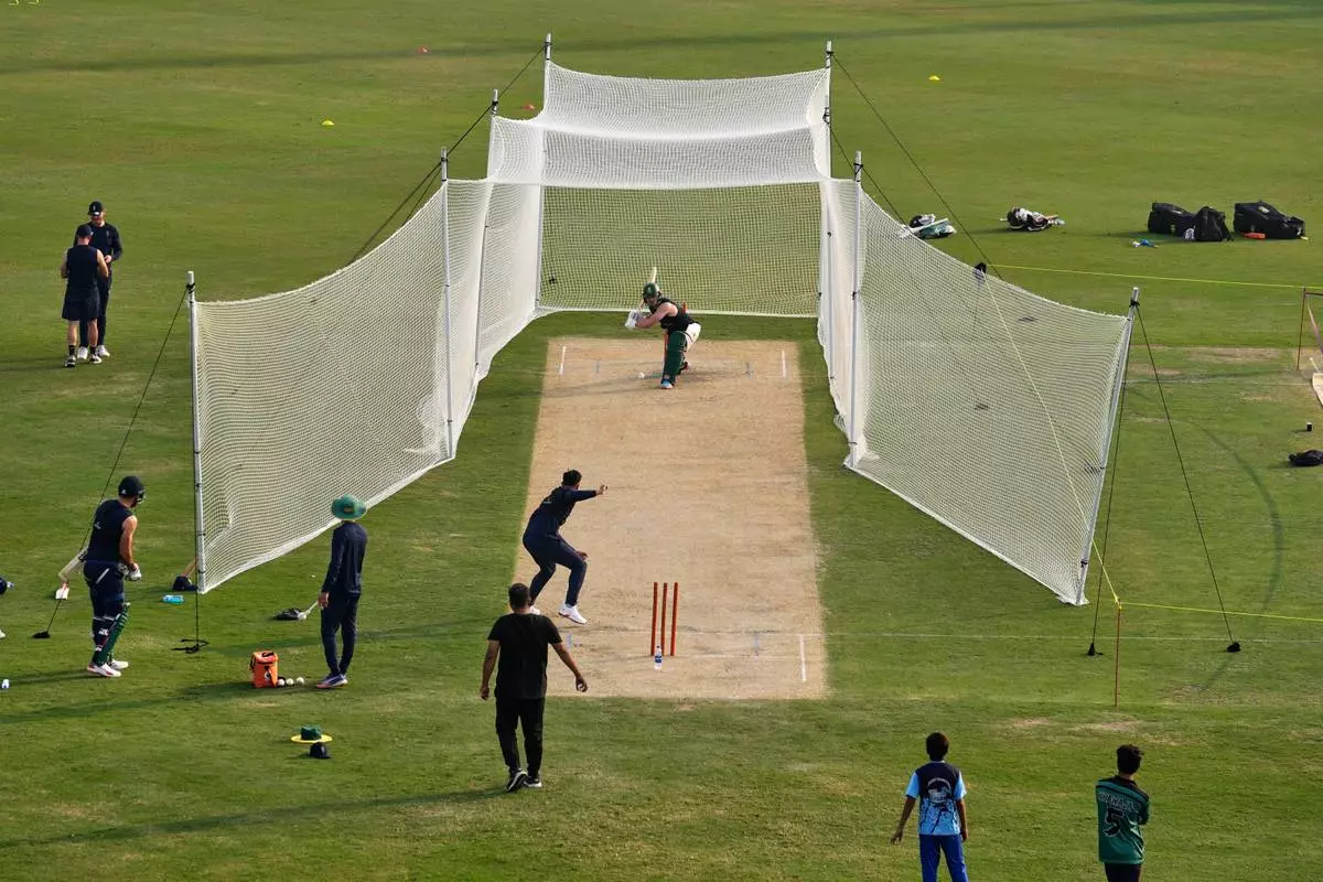 South Africa's Mathew Breetzke, top center, attends a practice session, in Faisalabad, Pakistan, Monday, Nov. 3, 2025. (AP Photo/Anjum Naveed)