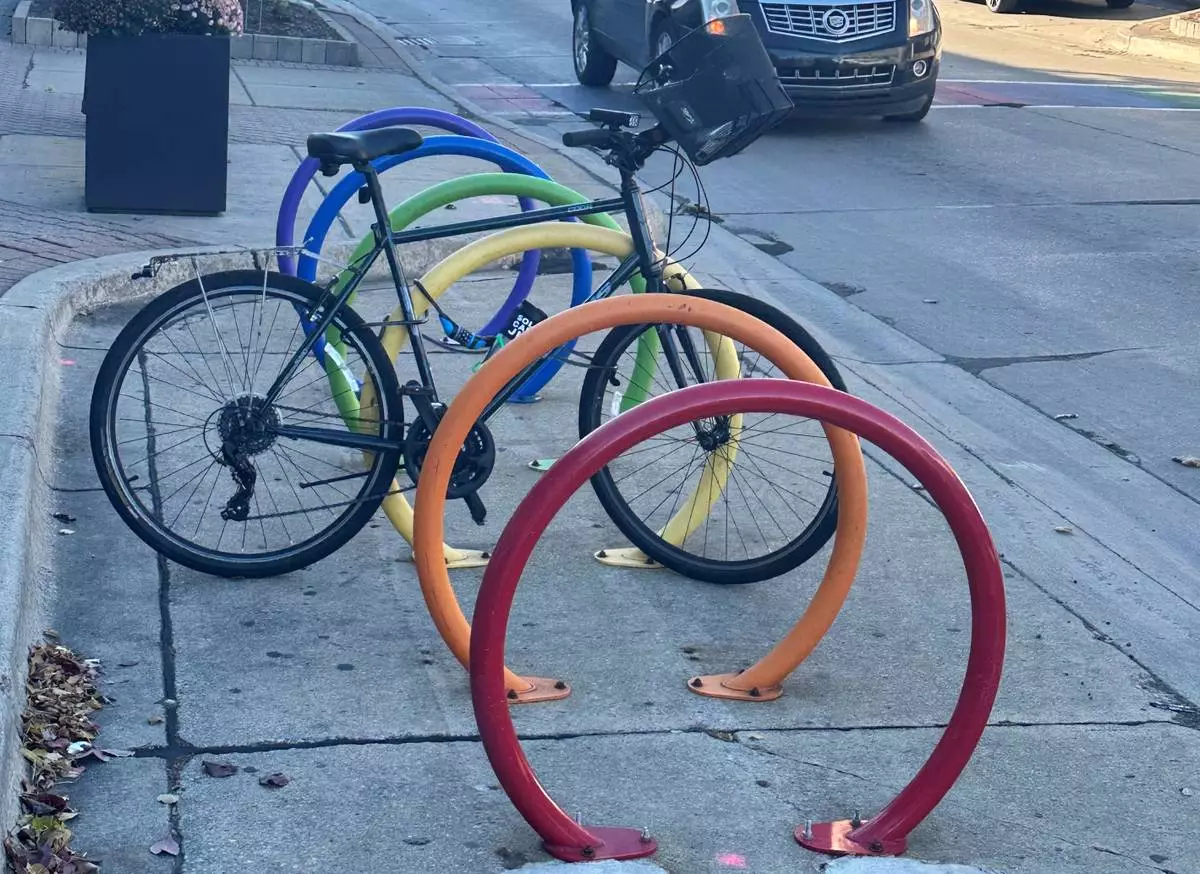 A bicycle is parked at a rainbow-themed bike rack along Nine Mile Road in Ferndale, Mich., Monday, Nov. 3, 2025. (AP Photo/Corey Williams)