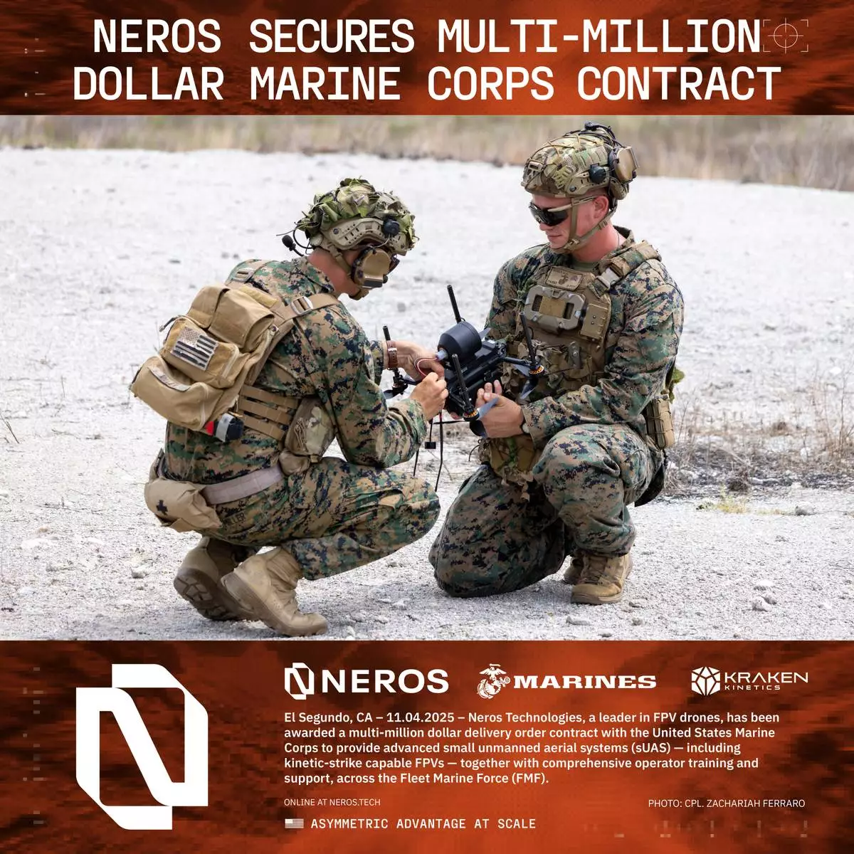 Neros Technologies has been awarded a multi-million dollar delivery order contract with the United States Department of War in support of the Marine Corps to provide advanced small unmanned aerial systems (sUAS) — including kinetic-strike capable FPVs — together with comprehensive operator training and support, across the Fleet Marine Force (FMF) in support of DoW priorities to unleash American drone dominance.