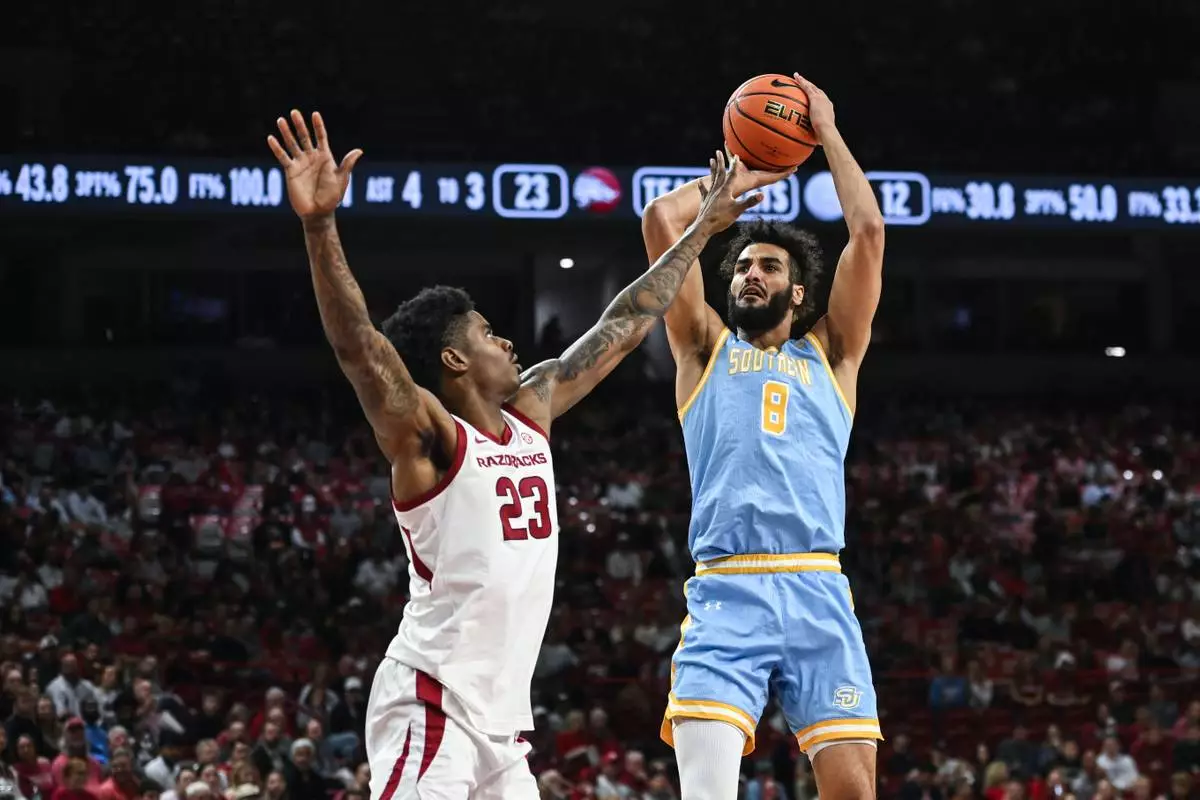 Southern forward Malek Abdelgowad (8) shoots over Arkansas forward Nick Pringle (23) during the first half of an NCAA college basketball game Monday, Nov. 3, 2025, in Fayetteville, Ark. (AP Photo/Michael Woods)