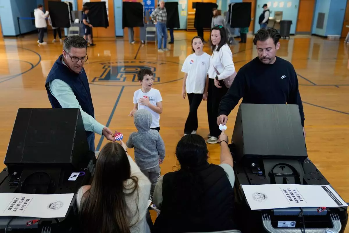 Voters receive stickers after voting at a polling site in River Edge, N.J., Tuesday, Nov. 4, 2025. (AP Photo/Seth Wenig)