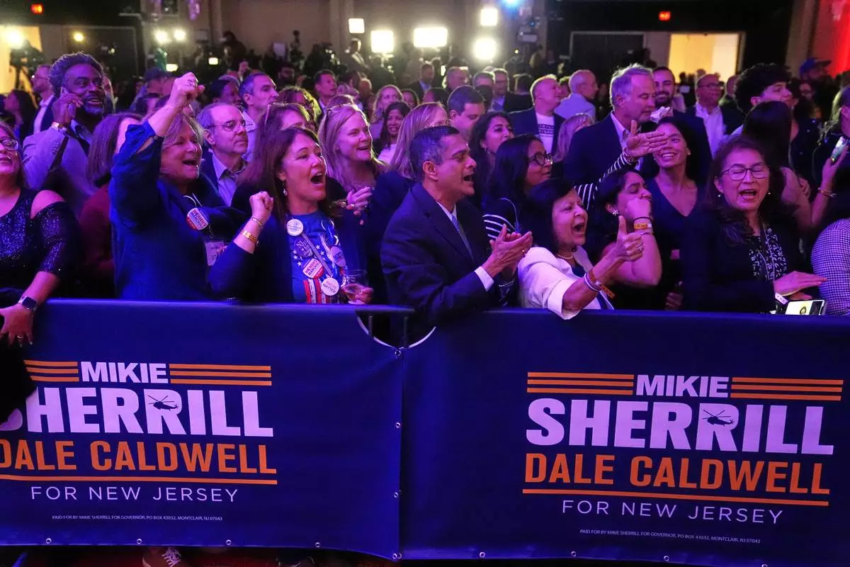 Supporters at New Jersey Democratic gubernatorial candidate Mikie Sherrill's election night party cheer as early results are seen in East Brunswick, N.J., Tuesday, Nov. 4, 2025. (AP Photo/Matt Rourke)