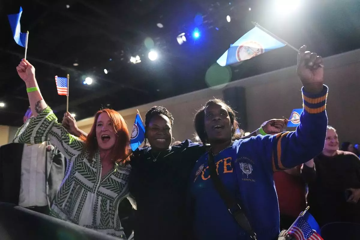 People cheer during an election night watch party for Virginia Democratic gubernatorial candidate Abigail Spanberger, Tuesday, Nov. 4, 2025, in Richmond, Va. (AP Photo/Stephanie Scarbrough)