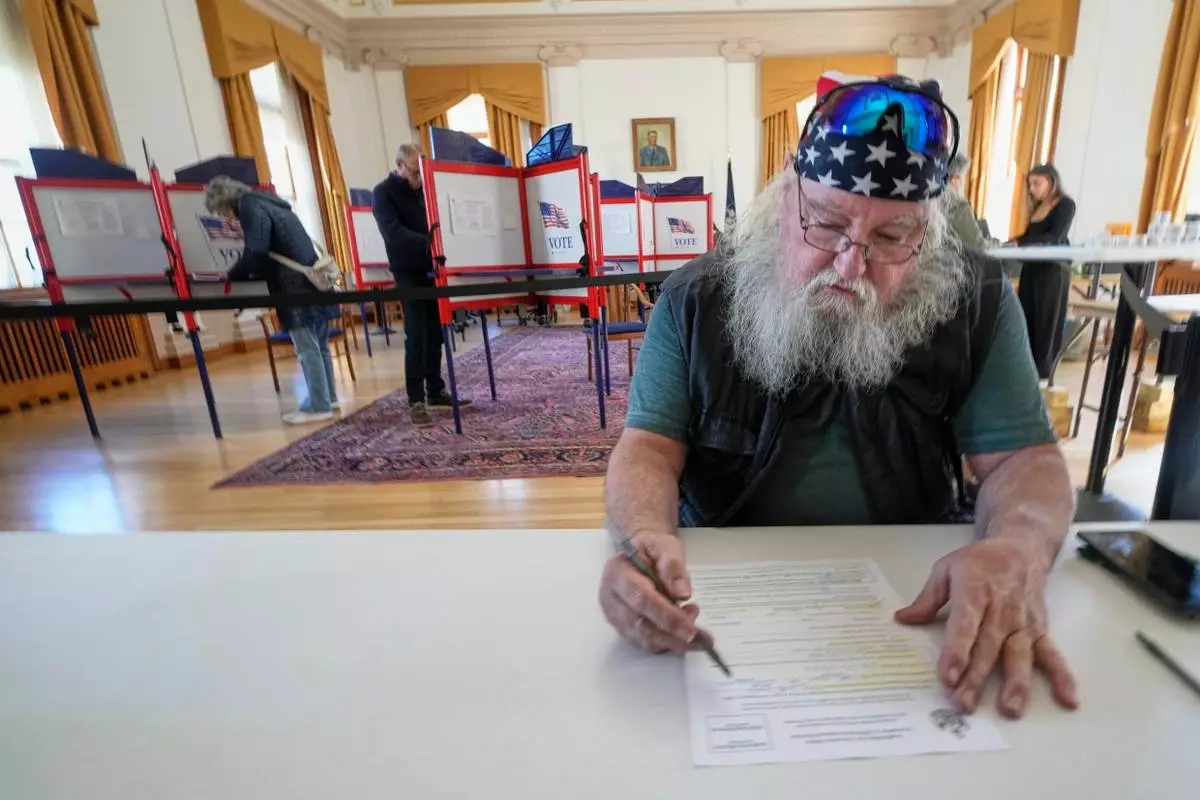 Terry O'Neill casts his ballot while voting at City Hall, Tuesday, Nov. 4, 2025, in Ellsworth, Maine. (AP Photo/Robert F. Bukaty)