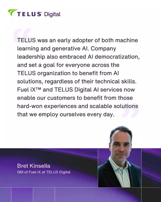 “TELUS was an early adopter of both machine learning and generative AI. Company leadership also embraced AI democratization and set a goal for everyone across the TELUS organization to benefit from AI solutions, regardless of their technical skills,” said Bret Kinsella, GM of Fuel iX, TELUS Digital. “That principle, along with a focus on ease of deployment, ease of use, and access to a multi-vendor catalog of AI technologies, led to broad adoption, fast innovation cycles and strong ROI. Fuel iX and TELUS Digital’s AI services now enable our customers to benefit from those hard-won experiences and scalable solutions that we employ ourselves every day.”