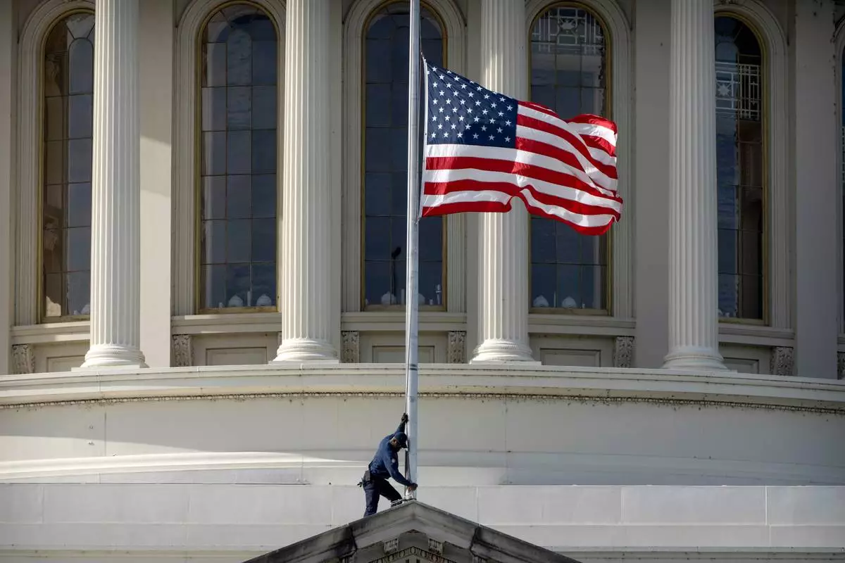 A worker lowers an American flag to half-staff, Tuesday, Nov. 4, 2025, at the Capitol in Washington. (AP Photo/Mark Schiefelbein)