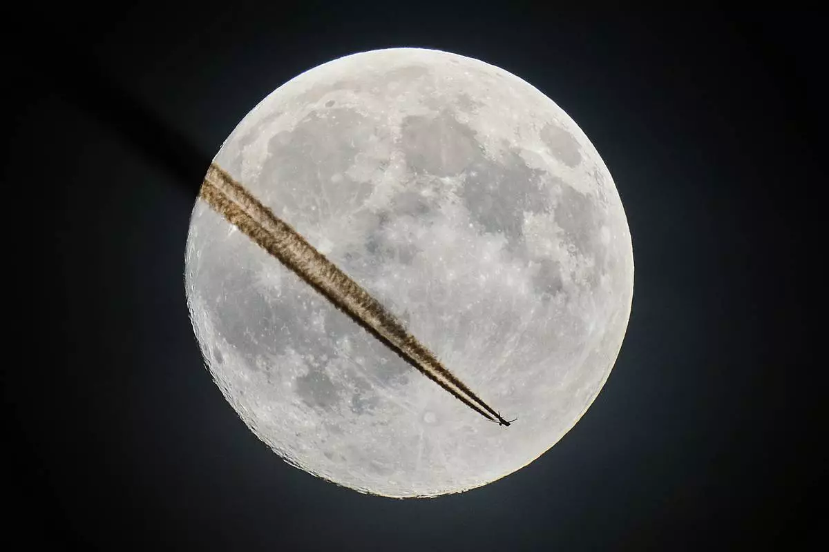 An aircraft passes the moon over Frankfurt, Germany, Tuesday, Nov. 4, 2025. (AP Photo/Michael Probst)