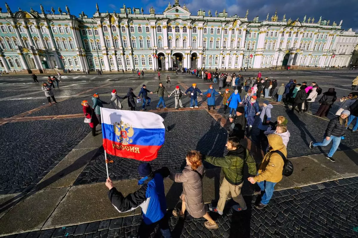 People dance in a circle marking National Unity Day at the Palace Square in St. Petersburg, Russia, Tuesday, Nov. 4, 2025. (AP Photo/Dmitri Lovetsky)