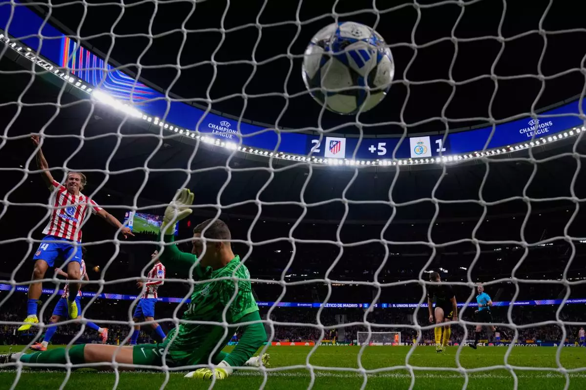Atletico Madrid's Marcos Llorente scores his side's third goal during a Champions League opening phase soccer match between Atletico Madrid and Union Saint-Gilloise in Madrid, Spain, Tuesday, Nov. 4, 2025. (AP Photo/Manu Fernandez)