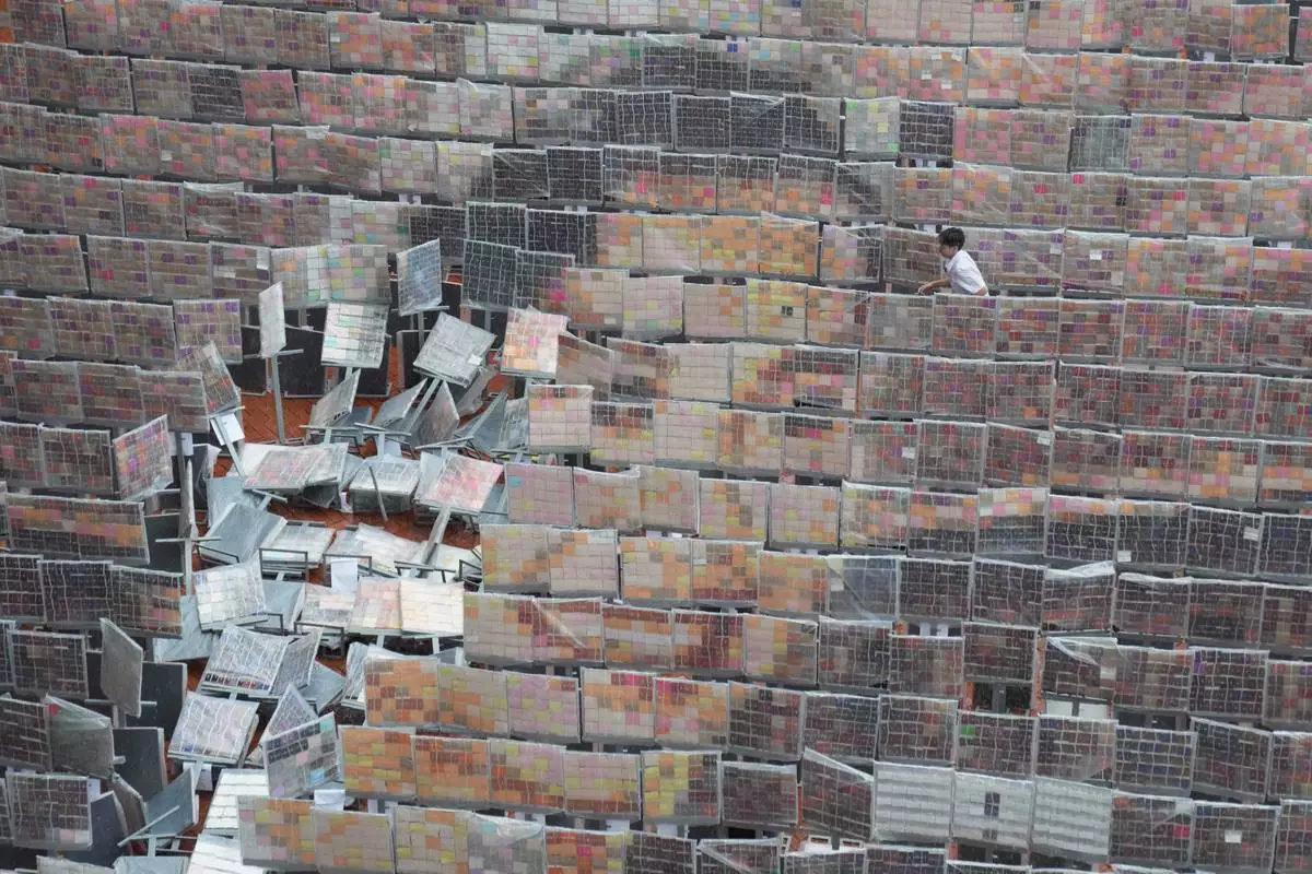A student attempts to keep boards dry during rain as a mosaic portrait of the Queen Mother Sirikit is displayed at Assumption College in Bangkok, Thailand, Tuesday, Nov. 4, 2025. (AP Photo/Sakchai Lalit)