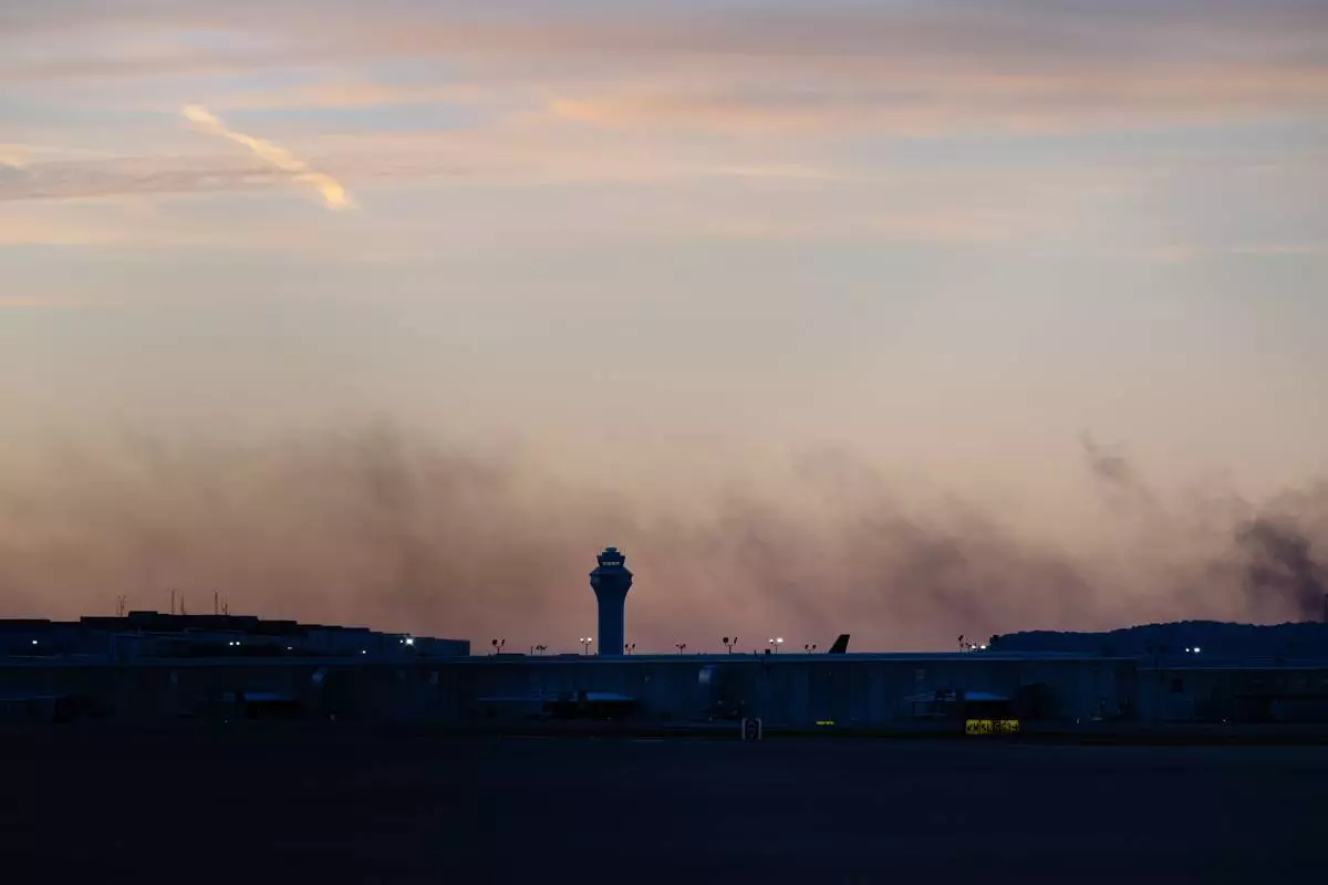 The ATC tower is seen while smoke rises from the crash site of UPS Flight 2796 near Louisville Muhammad Ali International Airport on Wednesday, Nov. 5, 2025, in Louisville, Ky. (AP Photo/Jon Cherry)