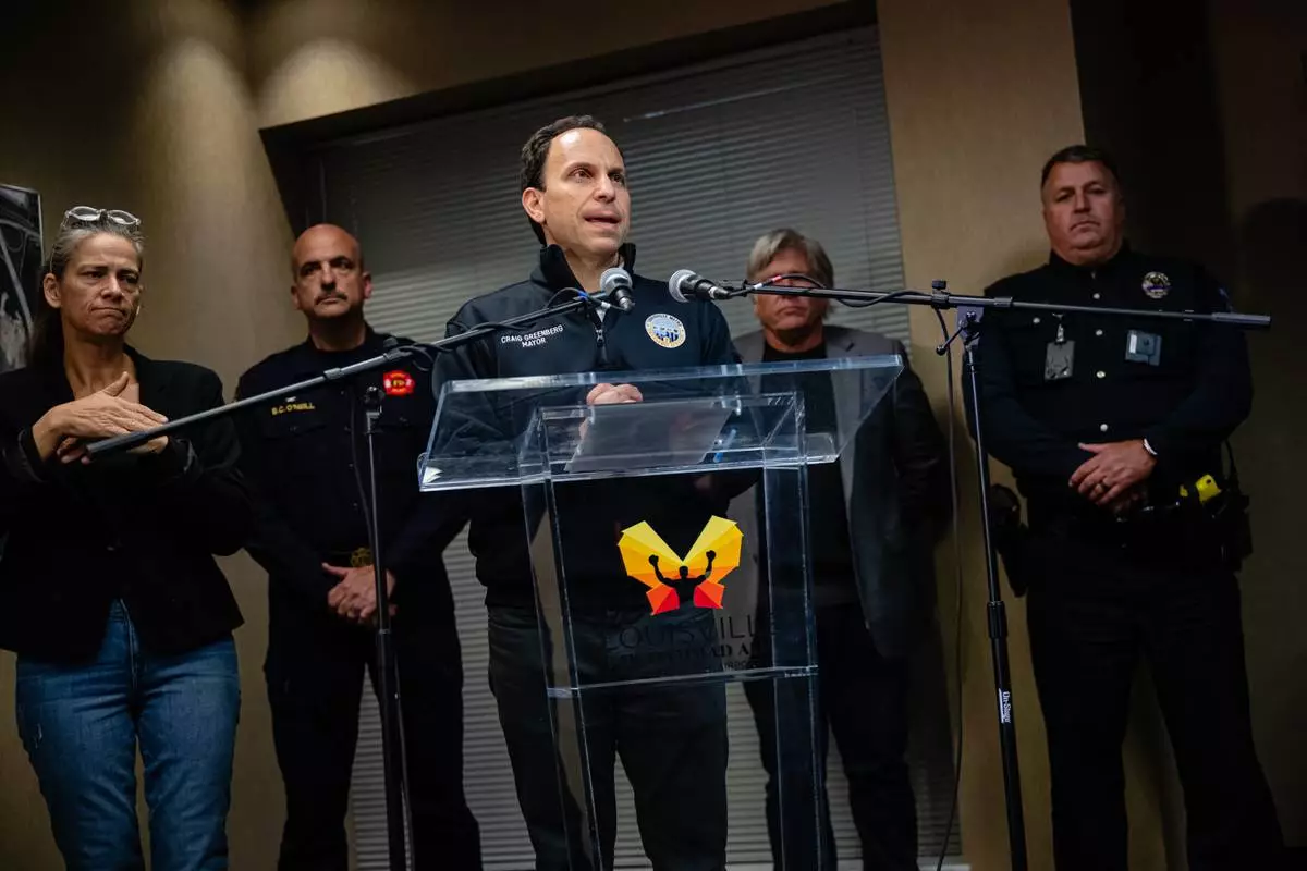 Mayor Craig Greenberg speaks at Louisville Regional Airport Authority about the crash of UPS Flight 2796 at Louisville Muhammad Ali International Airport on Tuesday, Nov. 4, 2025, in Louisville, Ky. (AP Photo/Jon Cherry)