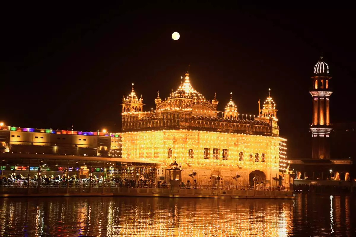 The supermoon rises behind the illuminated Golden Temple as Sikh devotees pray at the to mark the birth anniversary of their first guru, Guru Nanak, in Amritsar, India, Wednesday, Nov. 5, 2025. (AP Photo/Prabhjot Gill)