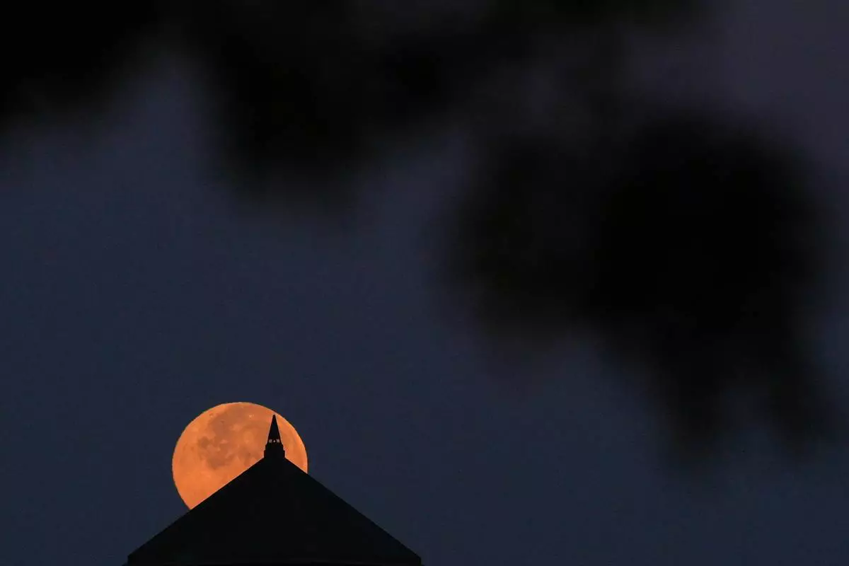 The full beaver supermoon sets beyond an office building Wednesday, Nov. 5, 2025, in Overland Park, Kan. (AP Photo/Charlie Riedel)