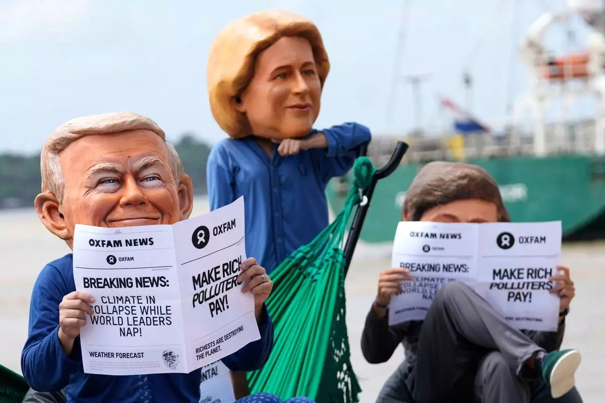 Oxfam activists wear puppet heads in the likeness of U.S. President Donald Trump, left, President of the European Commission Ursula von der Leyen, center, and President of Argentina Javier Milei as they protest ahead of the COP30 U.N. Climate Summit in Belem, Para state, Brazil, Wednesday, Nov. 5, 2025. (AP Photo/Eraldo Peres)
