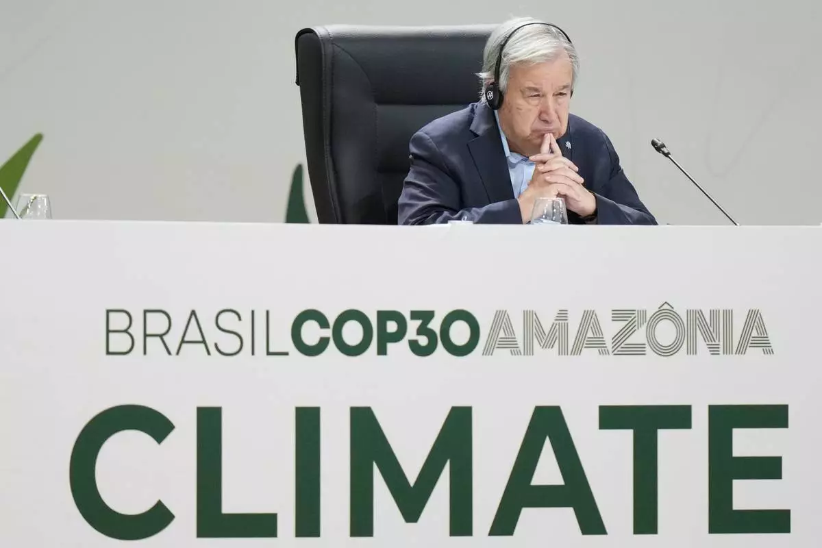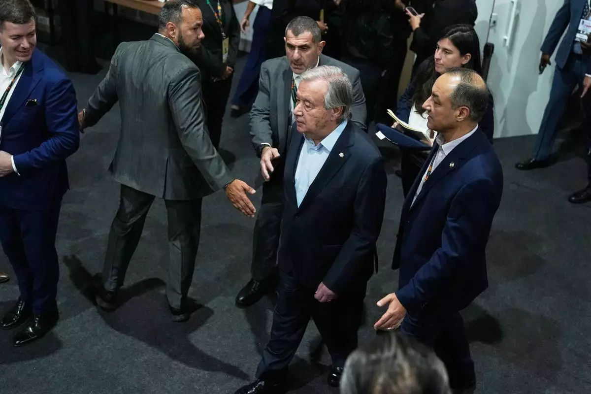 U.N. Secretary-General Antonio Guterres arrives to attend a plenary session at the COP30 U.N. Climate Summit in Belem, Brazil, Thursday, Nov. 6, 2025. (AP Photo/Fernando LLano)