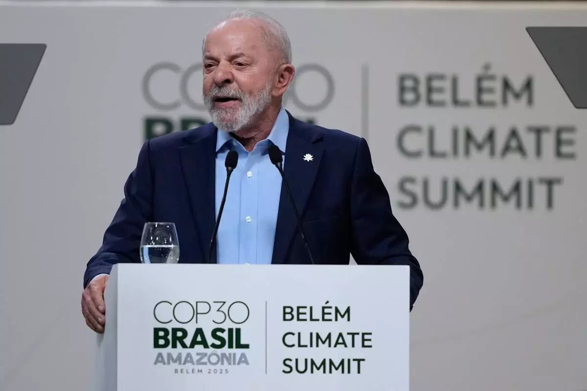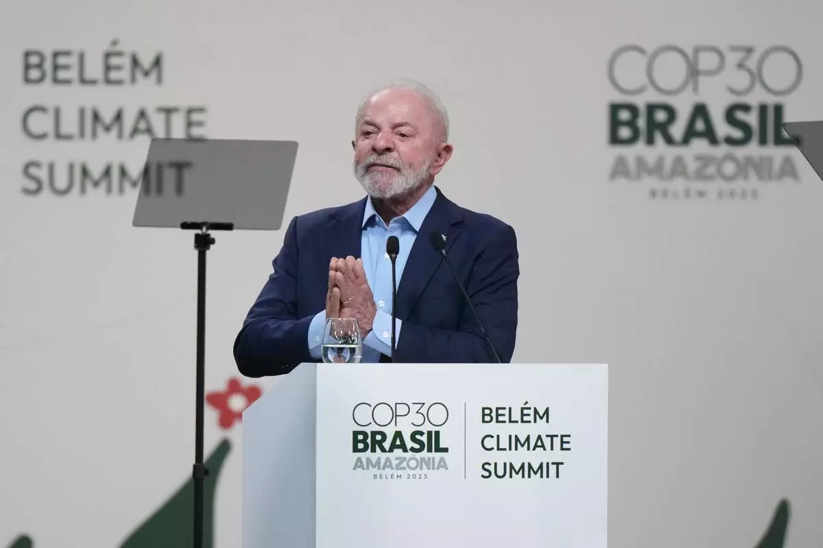Brazilian President Luiz Inacio Lula da Silva addresses a plenary session of the COP30 U.N. Climate Summit in Belem, Brazil, Thursday, Nov. 6, 2025. (AP Photo/Fernando Llano)