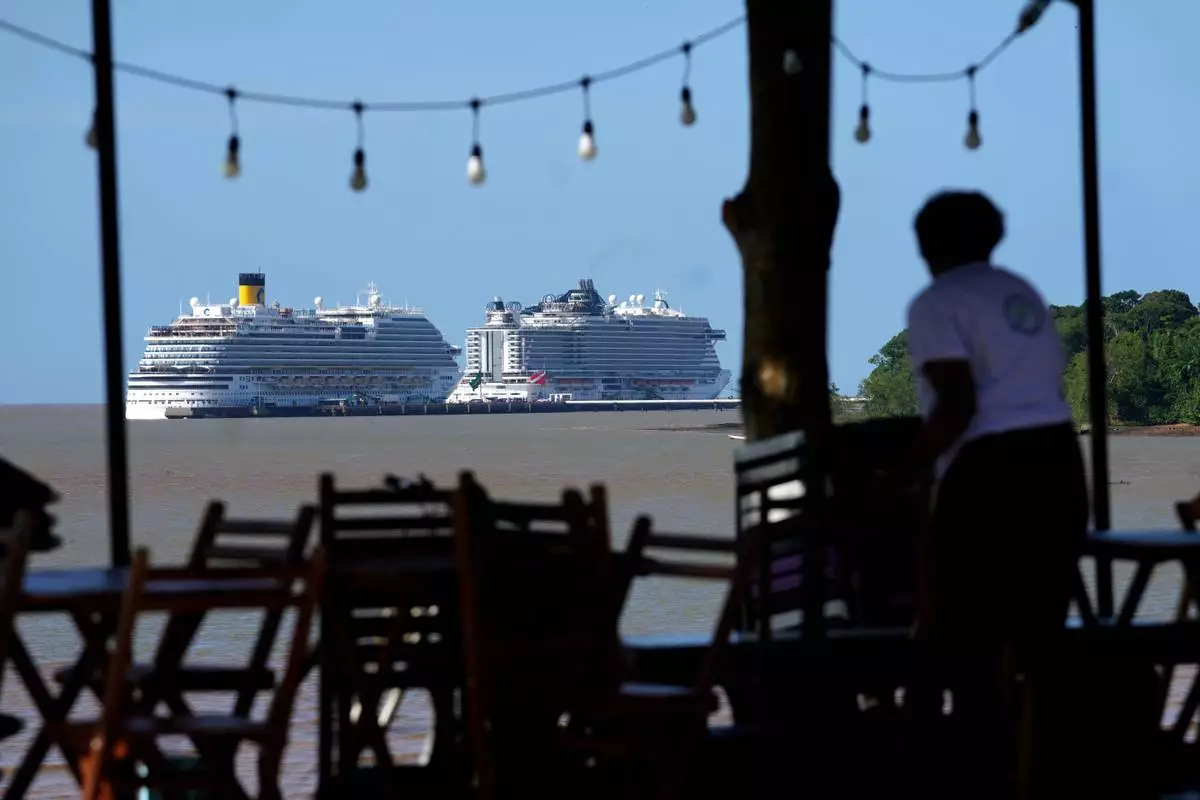 Ships arrive to accommodate participants at the COP30 U.N. Climate Summit, at the port of Outeiro in Belem, Para state, Brazil, Tuesday, Nov. 4, 2025. (AP Photo/Eraldo Peres)