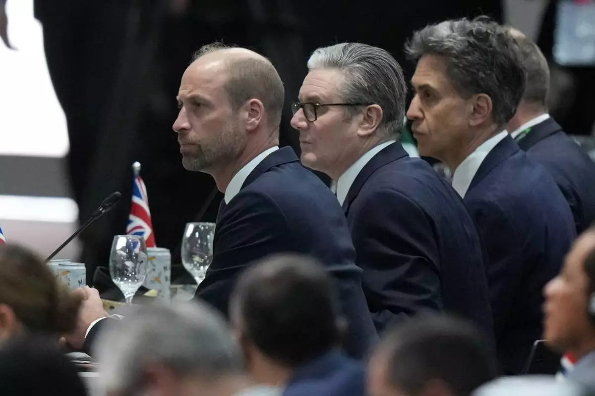 Britain's Prince William, left, and Britain's Prime Minister Keir Starmer, center, attend a plenary session at the COP30 U.N. Climate Summit, in Belem, Brazil, Thursday, Nov. 6, 2025. (AP Photo/Fernando Llano)