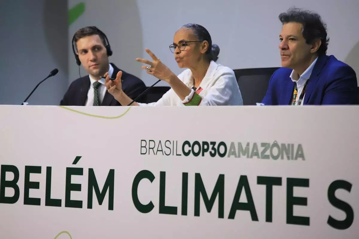 Brazil's Environment Minister Marina Silva, center, Minister of Climate and the Environment of Norway Andreas Bjelland Eriksen, left, and Brazil's Economy Minister Fernando Haddad hold a press conference during the COP30 U.N. Climate Summit, in Belem, Brazil, Thursday, Nov. 6, 2025. (AP Photo/Paulo Santos)