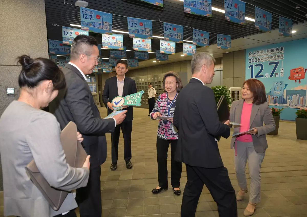 The nomination period for the 2025 Legislative Council General Election has ended today (November 6). The Secretary for the Civil Service, Mrs Ingrid Yeung, immediately led colleagues from the Civil Service Bureau (CSB) and staff-side representatives from various civil service staff unions to distribute leaflets at the Central Government Offices in Tamar, calling on civil servants to mobilise their families to vote together on December 7.