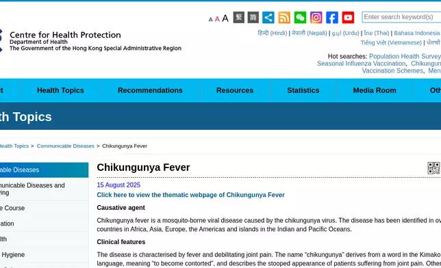 The case involves a 73-year-old male living alone in Tung Chung. A preliminary investigation revealed that he visited Foshan in Guangdong alone between October 20 and 30. He developed a fever and joint pain on November 4, and sought medical attention at the Accident and Emergency Department of North Lantau Hospital yesterday (November 5). He was admitted for treatment in a mosquito-free environment and is now in stable condition. His blood sample tested positive for the chikungunya virus upon laboratory testing.
