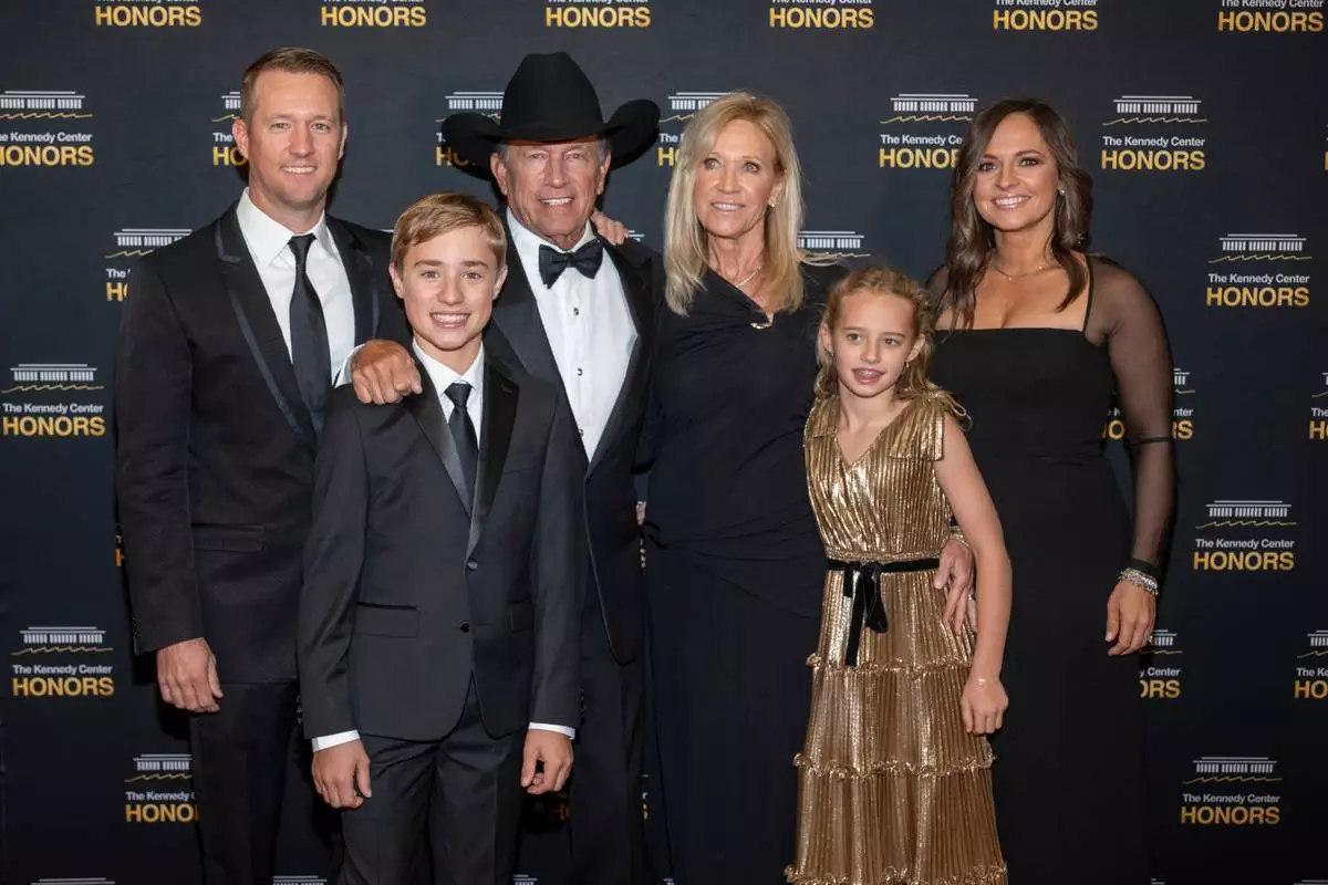 2025 Kennedy Center Honoree George Strait, center left, and his family arrive on the red carpet for the 48th Kennedy Center Honors Medallion Reception, hosted at the U.S. Department of State, Saturday, Dec. 6, 2025 in Washington. (AP Photo/Kevin Wolf)