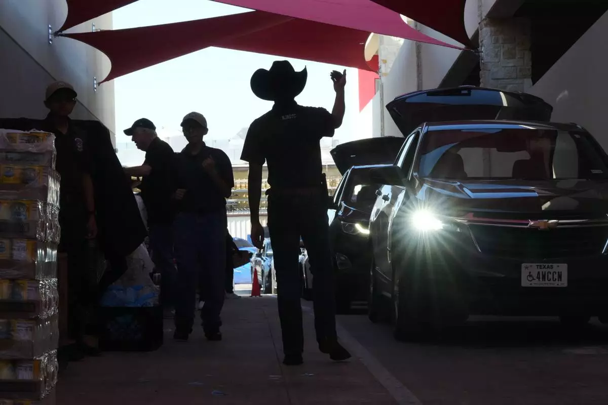 Aidan Tavor, center, directs traffic as volunteers help load vehicles during a food distribution at the San Antonio Food Bank for SNAP recipients and other households affected by the federal shutdown, Thursday, Nov. 6, 2025, in San Antonio. (AP Photo/Eric Gay)