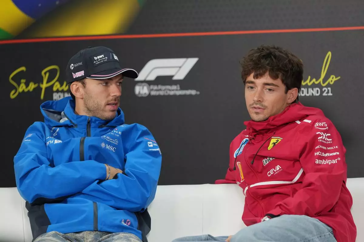 Alpine driver Pierre Gasly, of France, left, talks with Ferrari driver Charles Leclerc, of Monaco, during a press conference ahead of the Brazilian Formula One Grand Prix at the Interlagos race track in Sao Paulo, Thursday, Nov. 6, 2025. (AP Photo/Andre Penner)