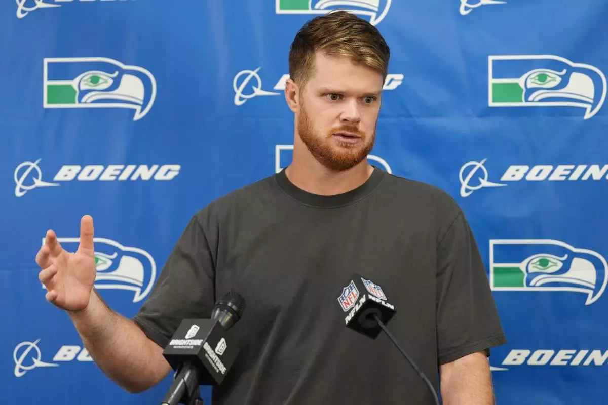 Seattle Seahawks quarterback Sam Darnold (14) speaking to members of the media after an NFL football game against the Washington Commanders, Monday, Nov. 3, 2025, in Landover, Md. Seattle won 38-14. (AP Photo/Stephanie Scarbrough)