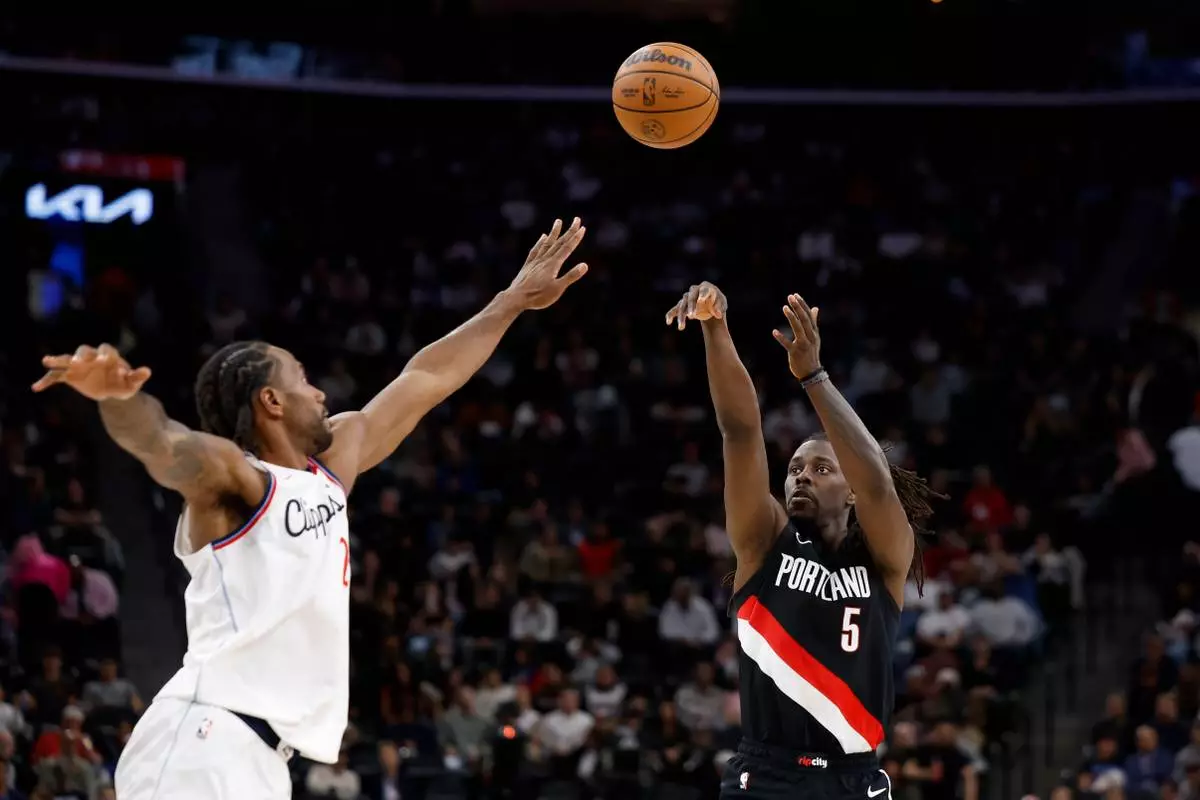 Portland Trail Blazers guard Jrue Holiday (5) shoots the ball while being guarded by LA Clippers forward Kawhi Leonard (2) during the first half of an NBA basketball game Tuesday, March 31, 2026, in Inglewood, Calif. (AP Photo/Caroline Brehman)