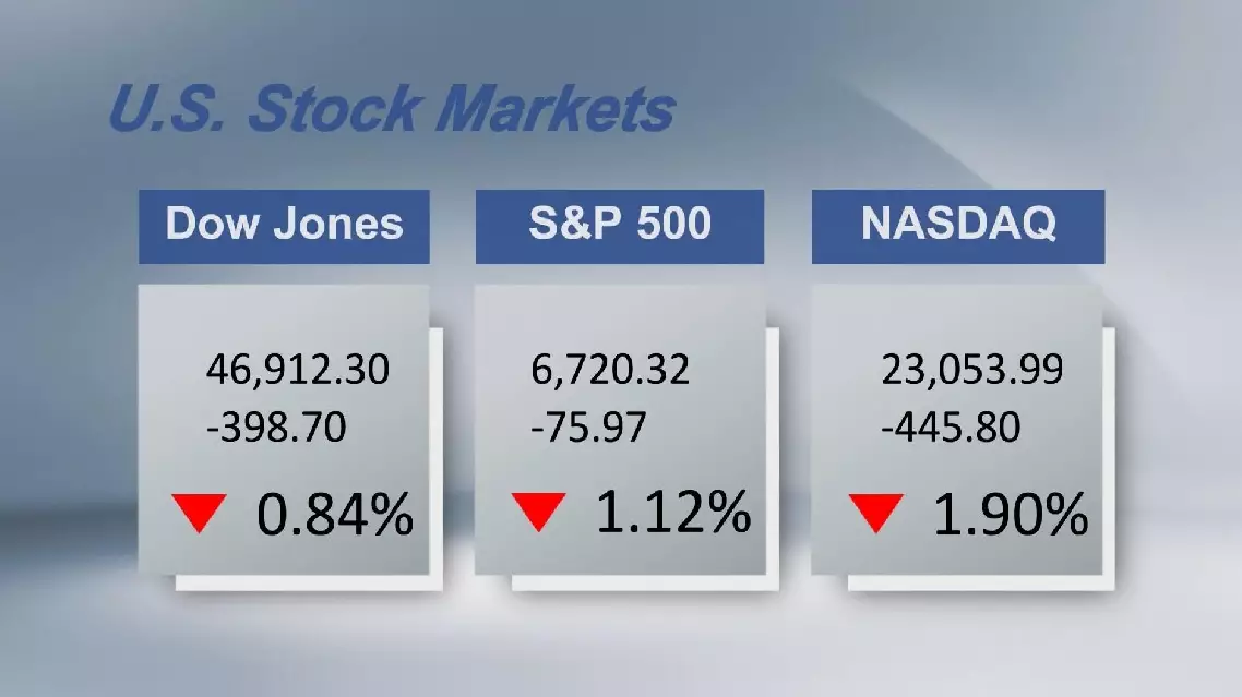 The Dow Jones Industrial Average fell by 398.70 points, or 0.84 percent, to 46,912.30. The S and P 500 sank 75.97 points, or 1.12 percent, to 6,720.32. The Nasdaq Composite Index shed 445.80 points, or 1.90 percent, to 23,053.99.