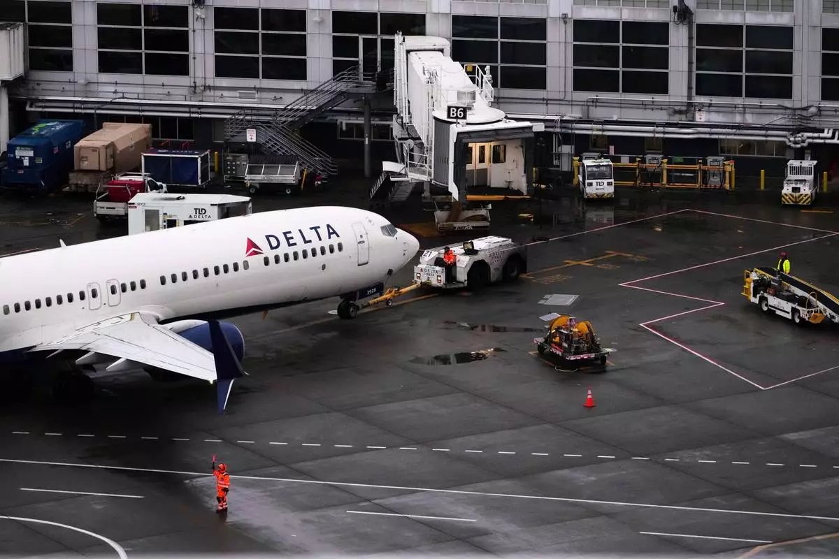 A ground crew worker signals a plane next to a Delta Airlines aircraft at Seattle-Tacoma International Airport, Thursday, Nov. 6, 2025, in SeaTac, Wash. (AP Photo/Lindsey Wasson)