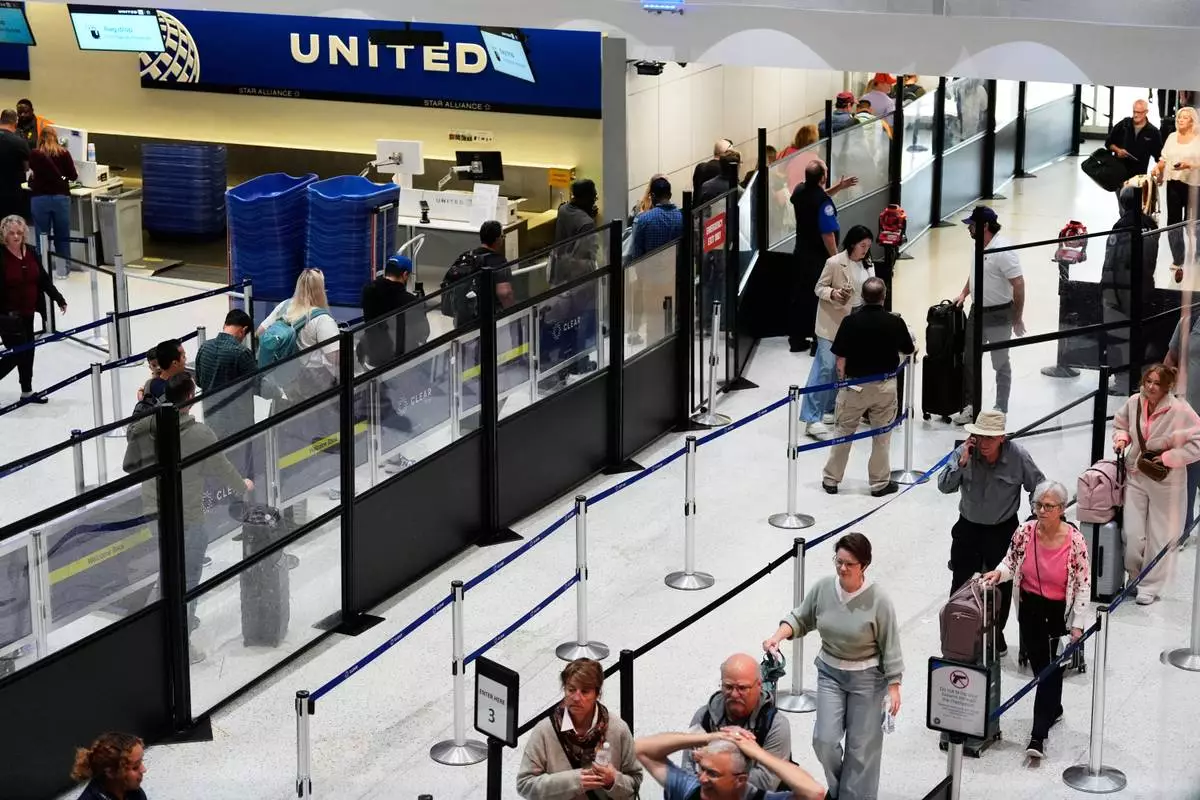 Travelers stand in line at a security checkpoint at George Bush Intercontinental Airport on Friday, Nov. 7, 2025, in Houston. (AP Photo/Ashley Landis)