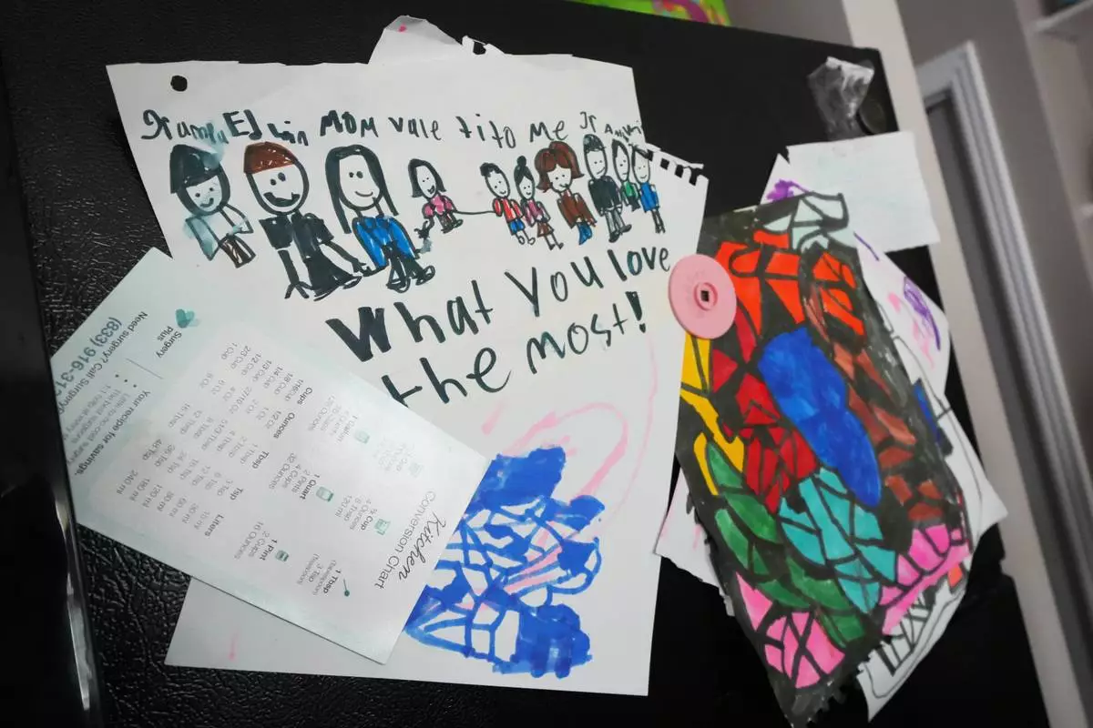 A child's drawing showing Edwin Sanchez-Mendoza and Cristina Osornio's family is seen on their refrigerator, Nov. 18, 2025, in Rogers, Ark. (AP Photo/Julio Cortez)