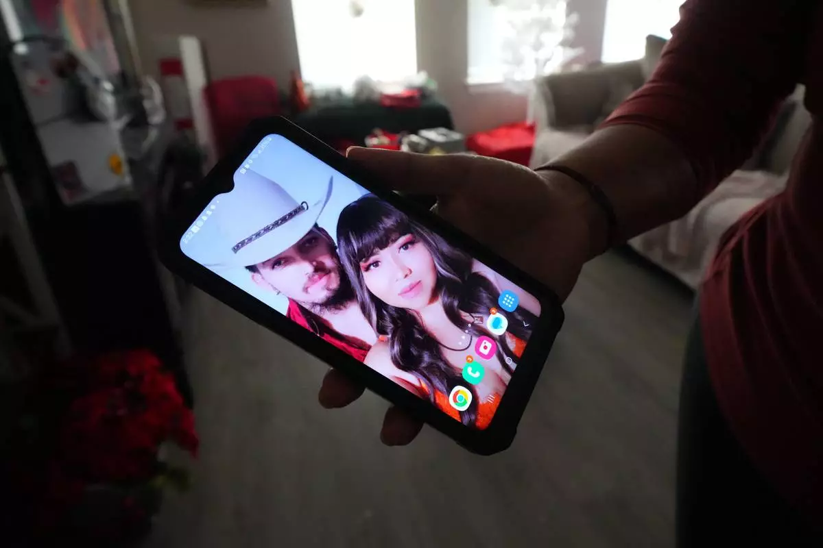 Cristina Osornio shows a photo, Nov. 18, 2025, in Rogers, Ark., of her and her husband, Edwin Sanchez-Mendoza, who signed deportation papers after being held in an immigration detention center for several months. (AP Photo/Julio Cortez)