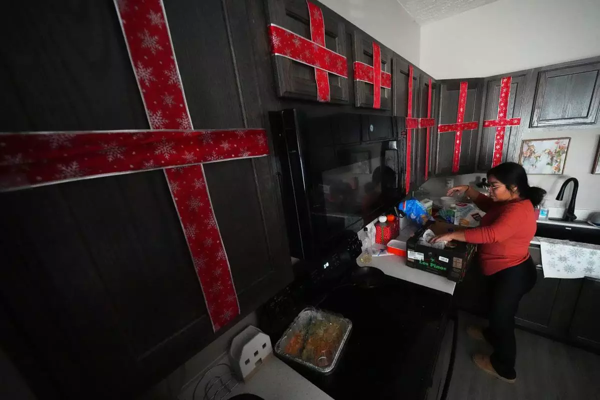 Cristina Osornio unpacks a box of groceries that was delivered to her home by a member of a community group, Nov. 18, 2025, in Rogers, Ark. (AP Photo/Julio Cortez)