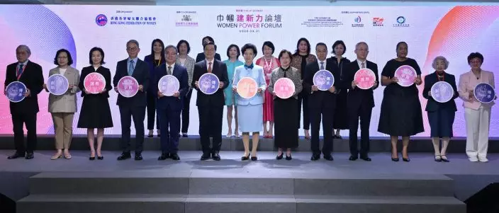 The Chief Executive, Mr John Lee, attended the Fourth Edition of Women Power Forum today (April 1). Photo shows State Councillor, Chairperson of the National Working Committee on Children and Women under the State Council and President of the All-China Women's Federation (AWF), Ms Shen Yiqin (front row, seventh right); Mr Lee (front row, eighth right); the Secretary of the Leading Party Members' Group, Vice-President and First Member of the Secretariat of the AWF, and Vice-Chairperson of the National Working Committee on Children and Women under the State Council, Ms Huang Xiaowei (front row, sixth right); Deputy Secretary-General of the State Council and Member of the Party Group of the State Council, Mr Liu Yuhui (front row, ninth right); Deputy Director of the Liaison Office of the Central People's Government in the Hong Kong Special Administrative Region (HKSAR) Mr Liu Guangyuan (front row, fifth right); Deputy Head of the Office for Safeguarding National Security of the Central People's Government in the HKSAR Mr Sun Qingye (front row, 10th right); Deputy Commissioner of the Office of the Commissioner of the Ministry of Foreign Affairs of the People's Republic of China in the HKSAR Mr Li Yongsheng (front row, fourth right); the Secretary for Home and Youth Affairs, Miss Alice Mak (front row, 12th right); the Chairperson of the Hong Kong Federation of Women, Ms Pansy Ho (front row, 11th right), and other guests at the event. Source: HKSAR Government Press Releases