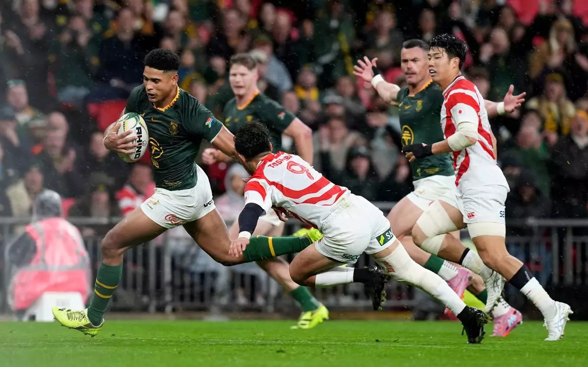 South Africa's Sacha Feinberg-Mngomezulu scores a try during the Quilter Nations Series match against Japan at Wembley Stadium in London on Saturday, Nov. 1, 2025. (Gareth Fuller/PA via AP)