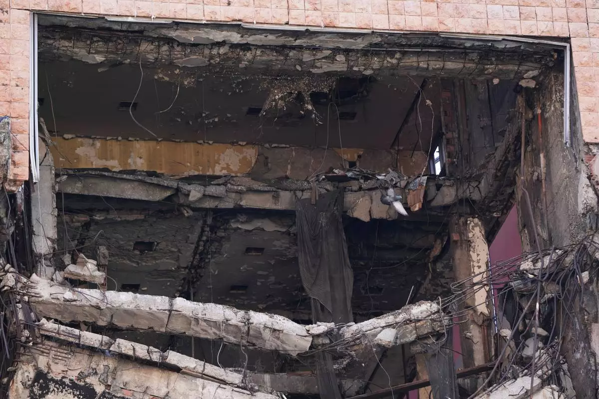 A pigeon flies through former Yugoslav army headquarters destroyed in a U.S.-led NATO bombing campaign in 1999, left, is seen in Belgrade, Serbia, Tuesday, Nov. 4, 2025. (AP Photo/Darko Vojinovic)